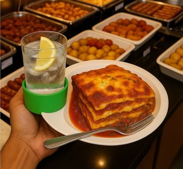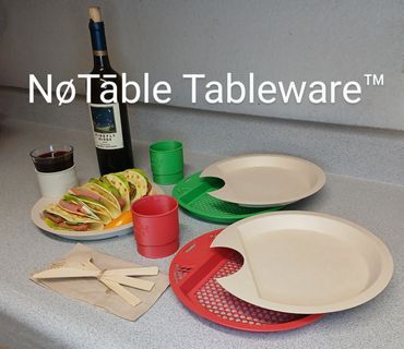 Revolutionary interlocking all-in-one plate and beverage carrier.