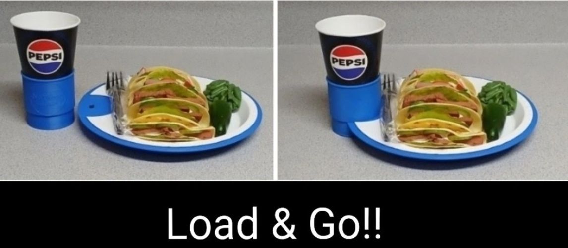 Revolutionary interlocking all-in-one plate and beverage carrier.